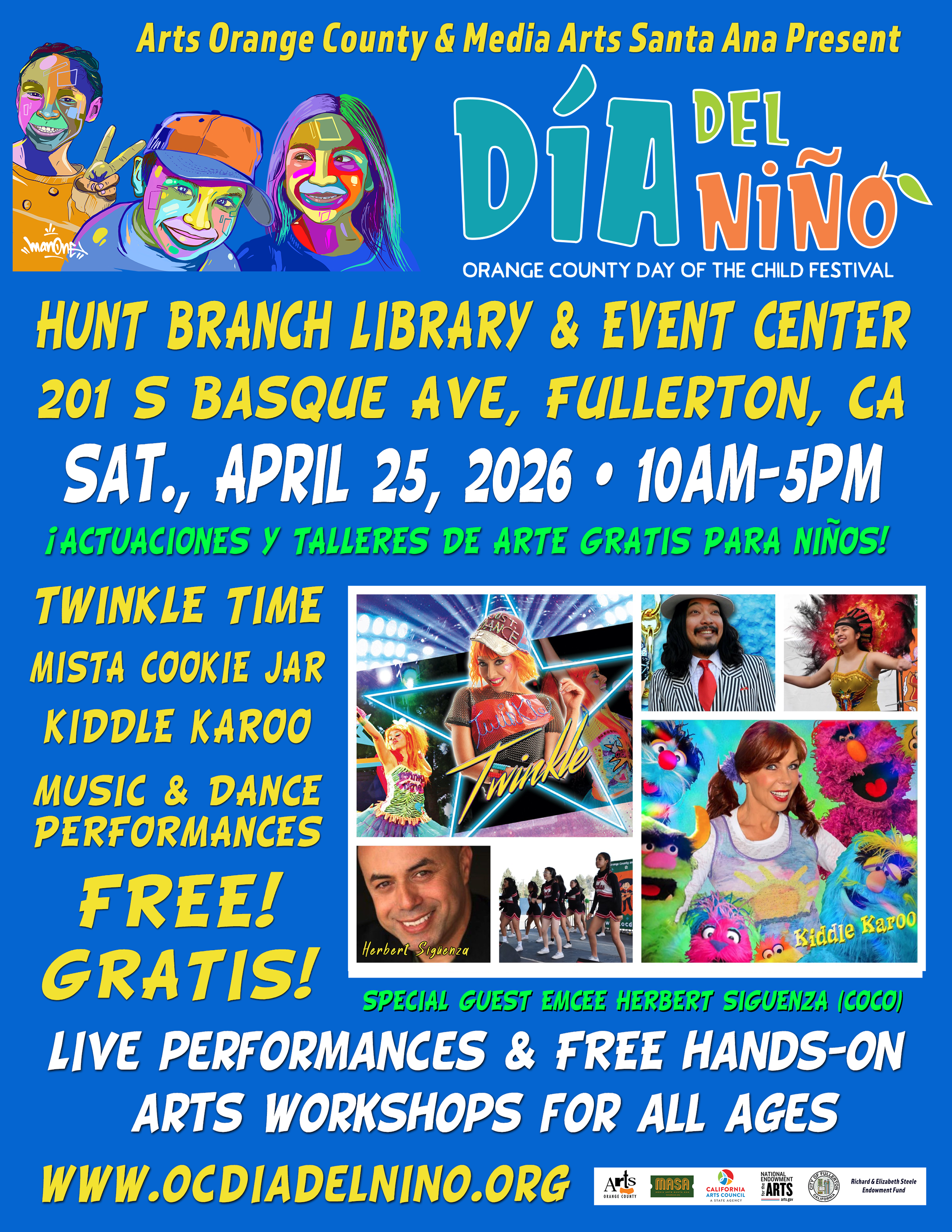 ¡MARQUEN SUS CALENDARIOS! El OC Día del Niño regresa a la Biblioteca Hunt el 25 de abril 2026 con grupos de música y danza para jóvenes increíbles de todo el condado y excelentes talleres de arte para niños hacen de este otro gran evento! ¡GRATIS! y divertido par toda la familia.